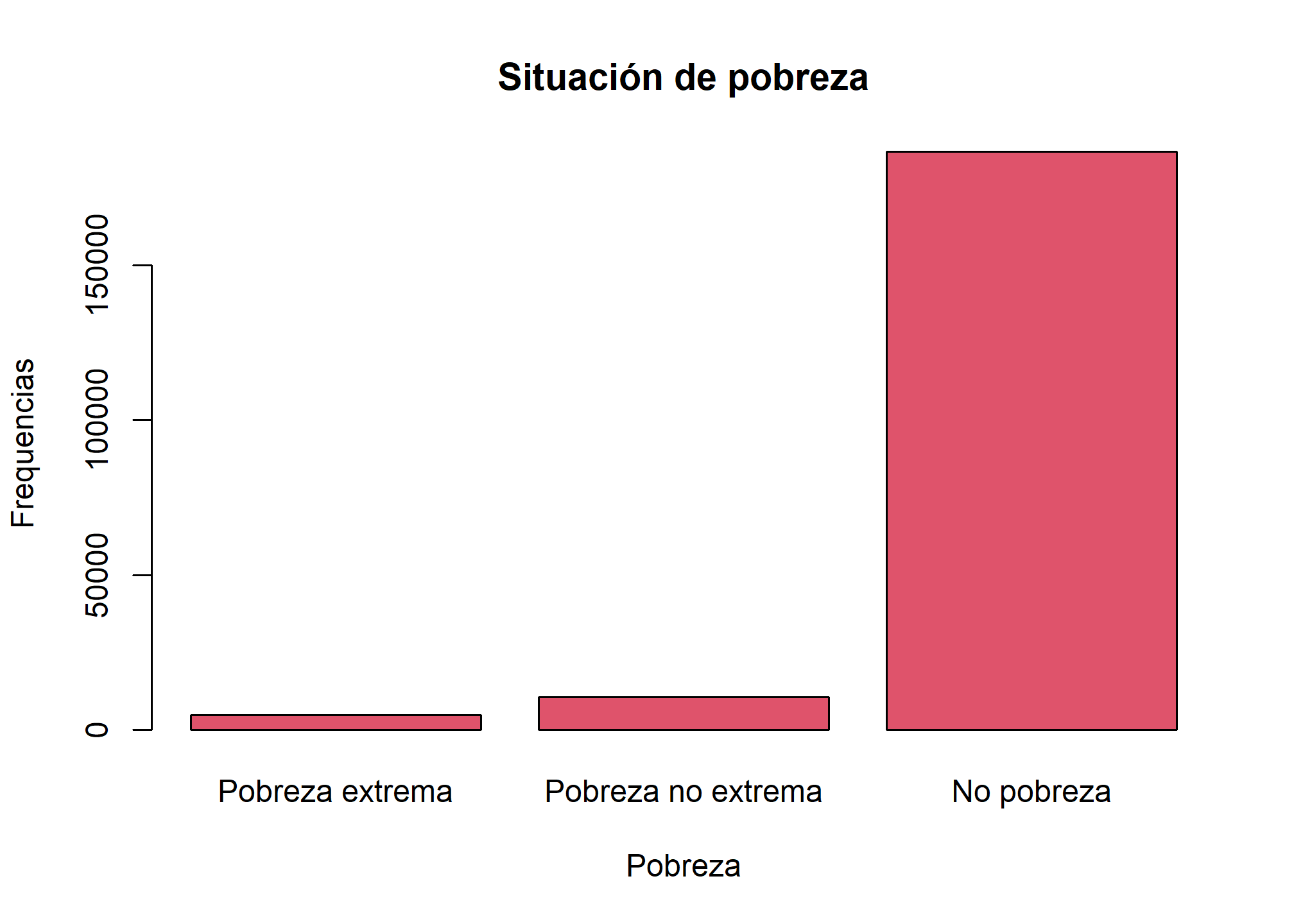 - mutate(pobreza1 = ifelse(pobreza %in% 1:2, 1, 0)): Crea una nueva columna “pobreza1” donde los individuos considerados pobres (con valores de “pobreza” de 1 o 2) se marcan con un 1, y los no pobres (valor de “pobreza” 3) con un 0.