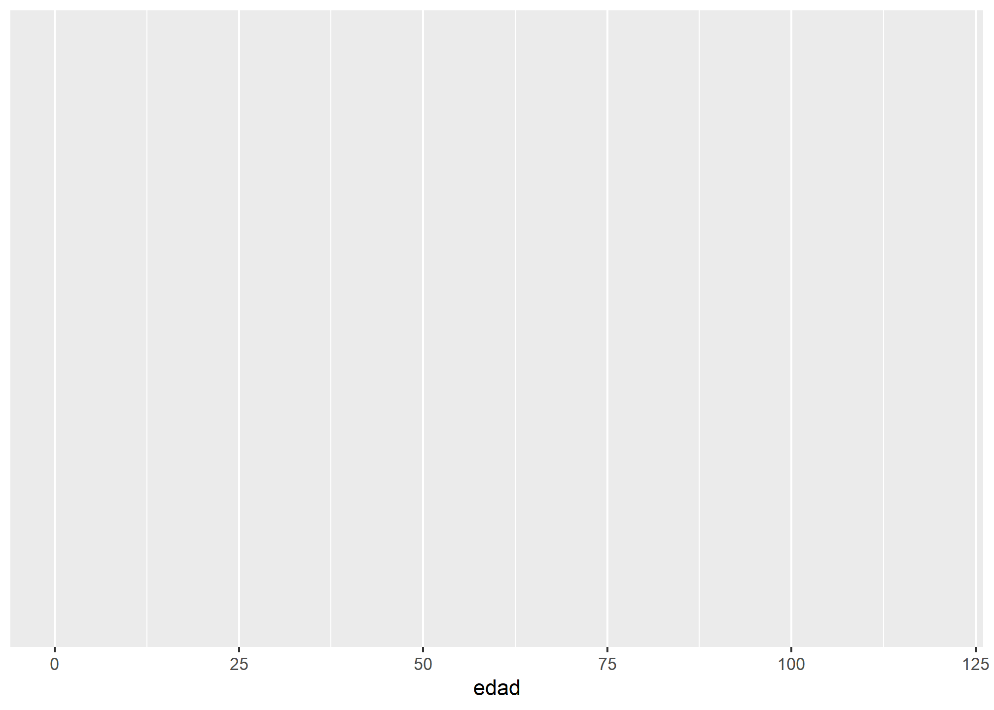 Por último, necesitamos decirle a ggplot como representar nuestros datos en el eje señalado mediante un geom, es decir, el objeto geométrico que se utilizará para representar los datos. Para esto hay múltiple funciones que empiezan con “geom_”, como geom_bar, geom_point o geom_line. En este caso queremos contruir un histograma así que usaremos geom_histogram.