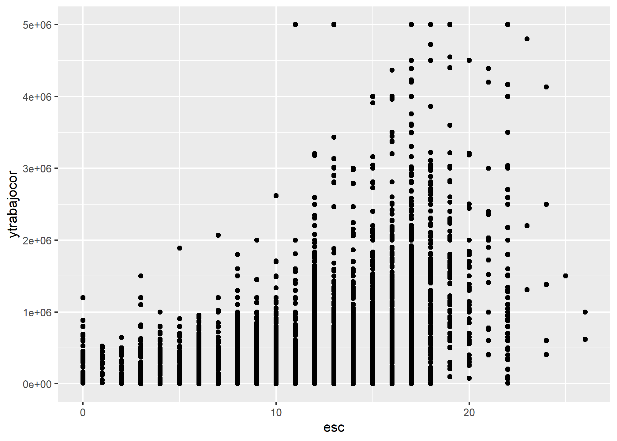 Ahora podemos observar de mejor manera que hay una relación positiva entre ambas variables, es decir que, a más escolaridad, en promedio los ingresos del trabajo son más altos.