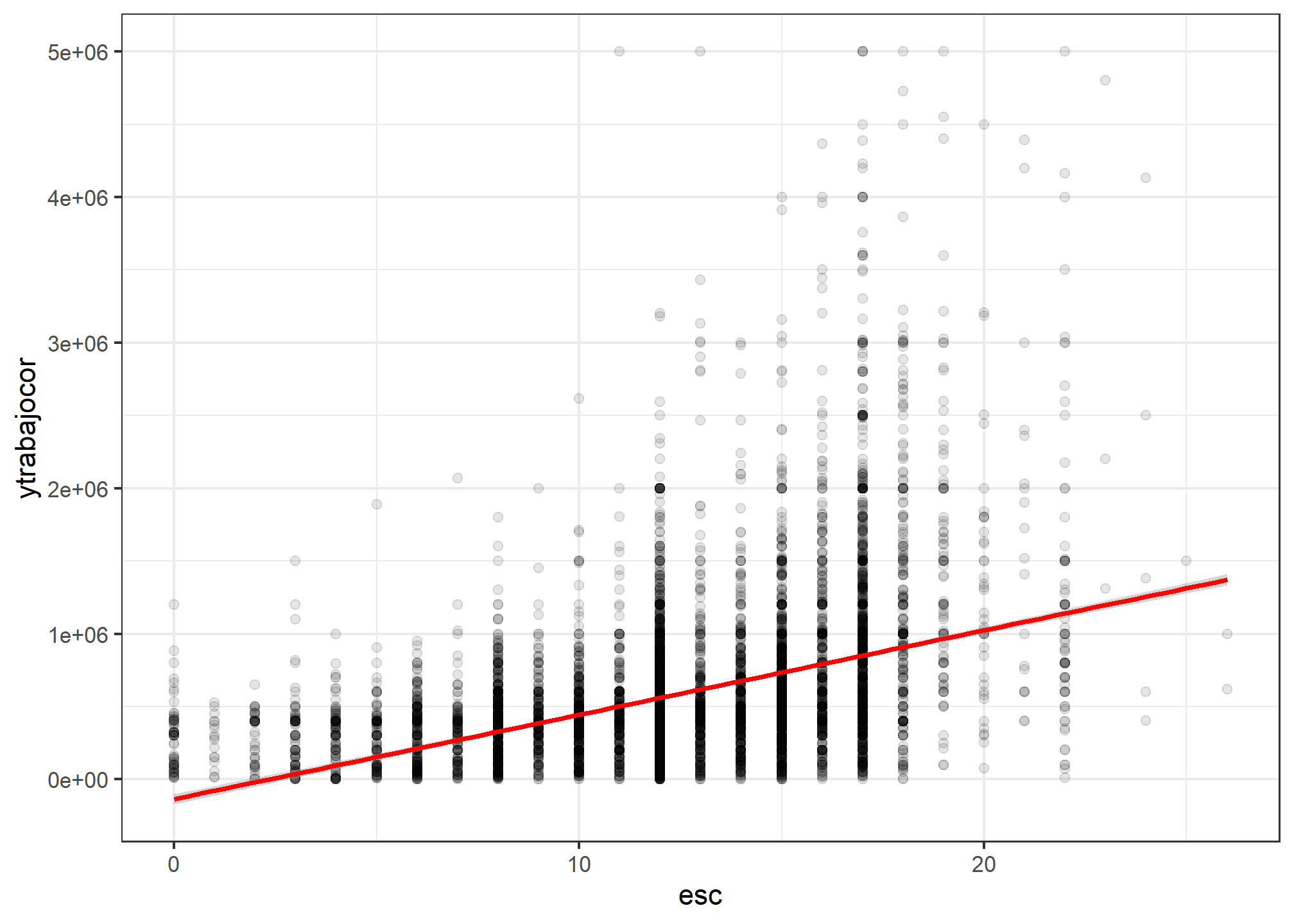 Como vemos el gráfico tiene la escolaridad en el eje x, y los ingresos en el eje y. sin embargo, dada la gran cantidad de puntos, la relación entre ambas variables no resulta tan clara. Para mejorar lo anterior haremos dos cambios, aplicaremos una transparencia a cada punto apra poder observar la densidad de los puntos en cada parte del gráfico, y añadiremos una linea de tendencia lineal con la función geom_smooth().