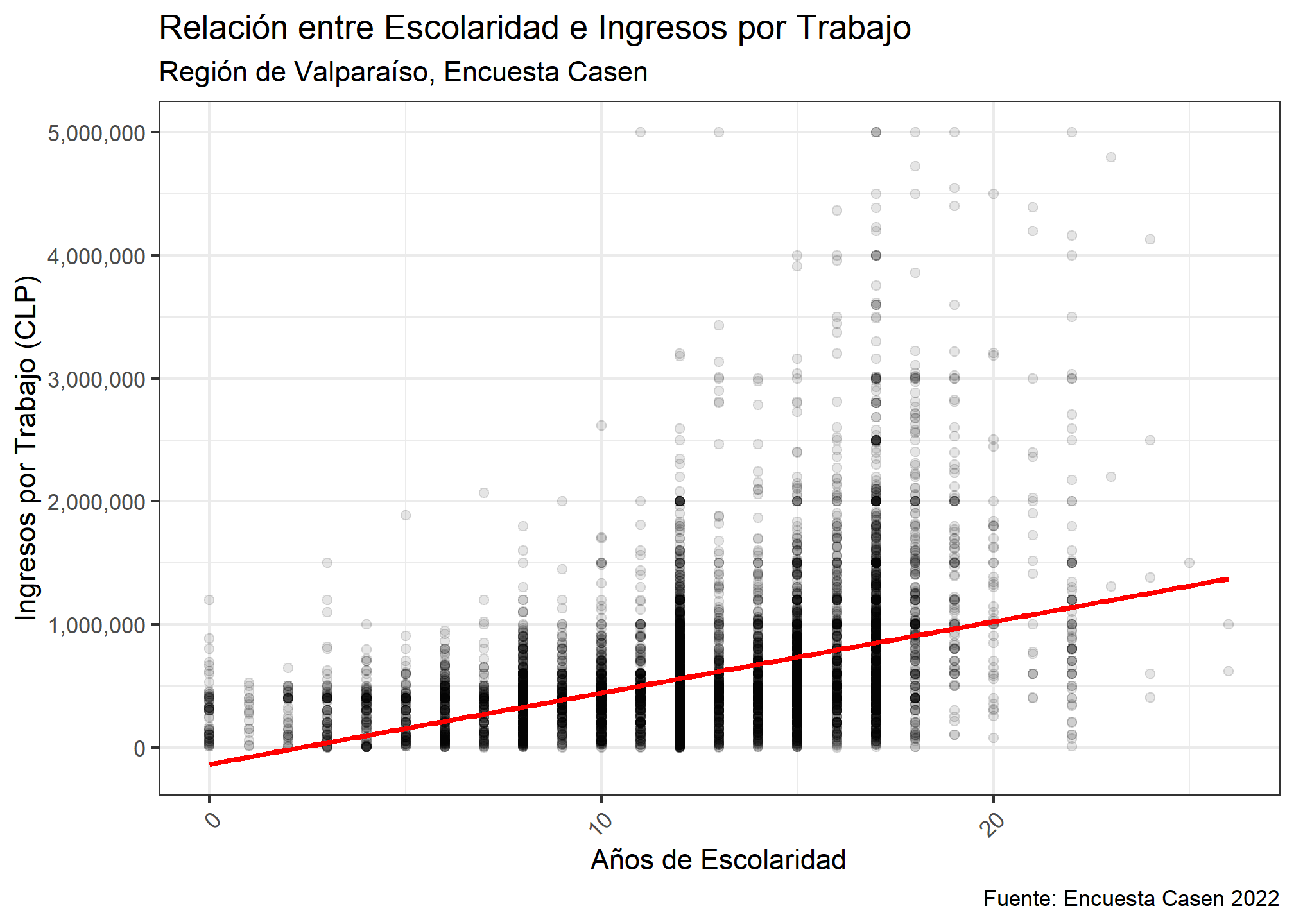 Ahora veamos el ejemplo de un gráfico bivariado. para esto debemos fijar una varaible en cada eje para las aesthetics. En este caso veremos la relación entre años de escolaridad y ingresos del trabajo. Para esto usaremos un scatterplot, construido a partir de geom_point(). Filtraremos la base de datos a la Región de Valparaíso para reducir la cantidad de datos a graficar, y limitaremos los datos hasta 5 millones de peso para evitar valores muy extremos que dificulten la visualización.