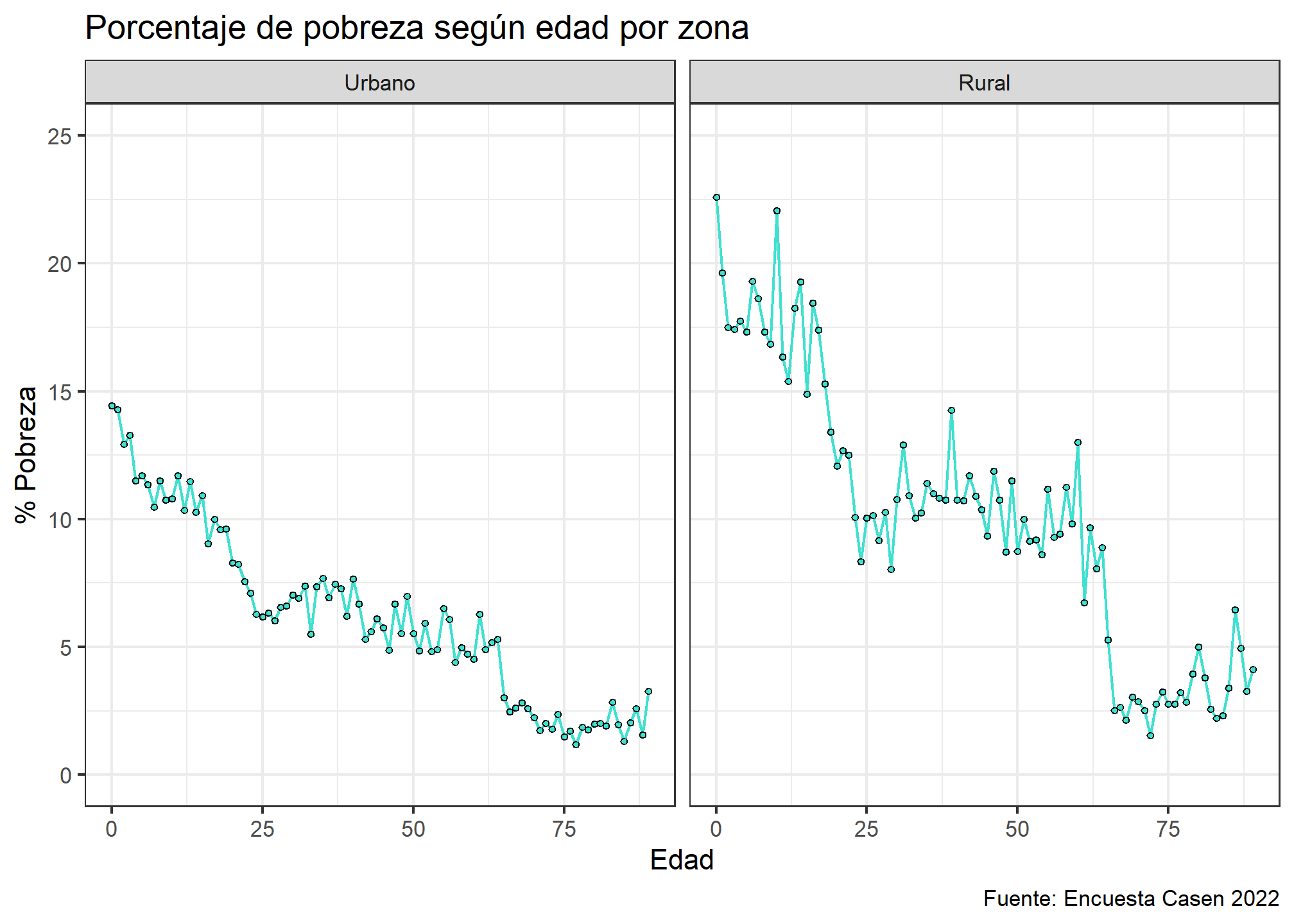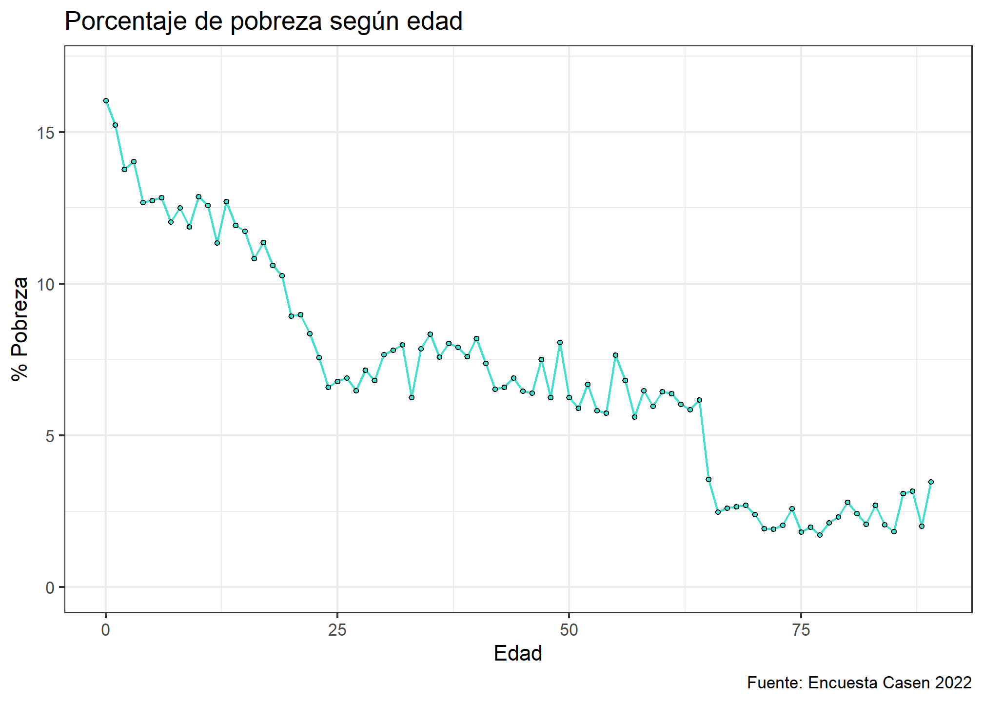Luego a partir de esta base de datos contruimos el gráfico, ocupando dos geom, geom_point() y geom_line(), para dibujar una línea y puntos en cada edad, para visualizar la tendencia de la pobreza con la edad.