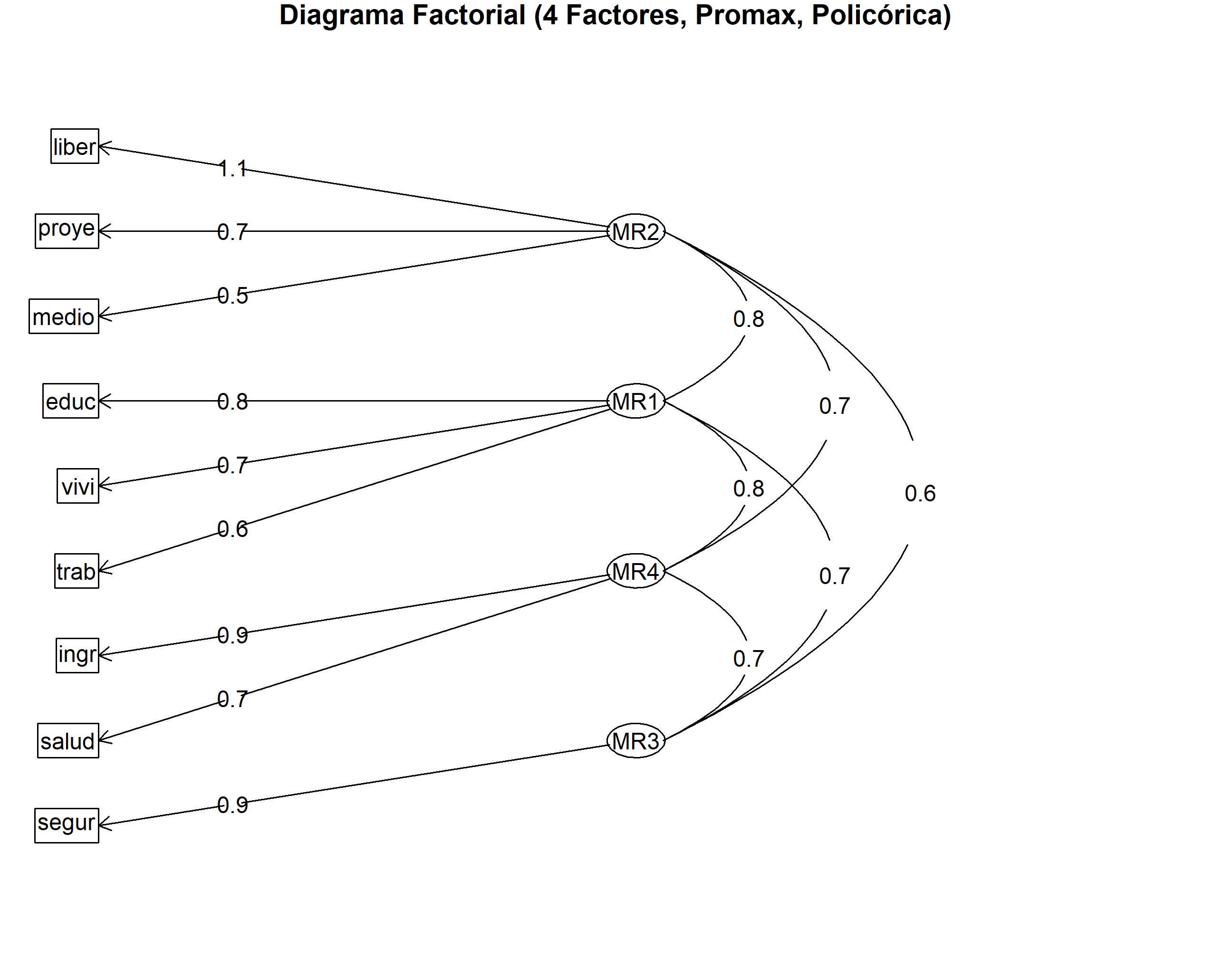 educ(0.76),vivi(0.71) ytrab(0.58).proyetiene una carga secundaria aquí (0.32). Interpretación tentativa: “Oportunidades Socioeconómicas Estructurales”. - MR4: Cargas principales en