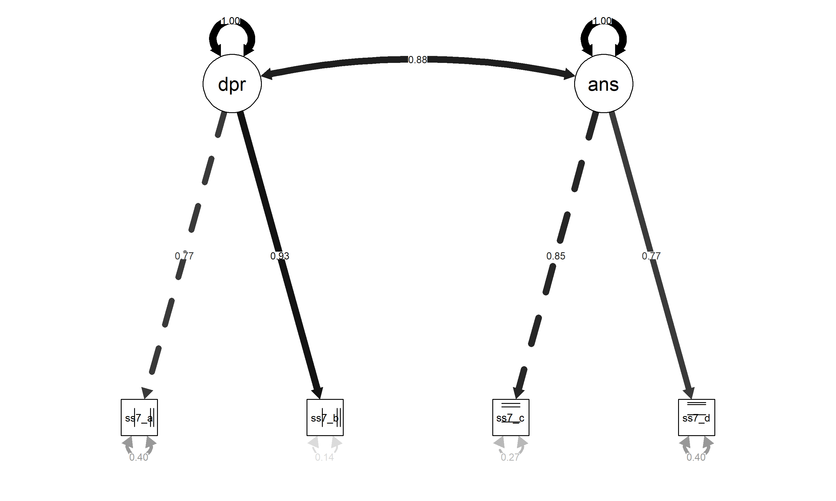 El diagrama visualiza claramente la estructura del modelo. Vemos los dos factores latentes (círculos) y sus respectivos indicadores (rectángulos). Las flechas muestran las cargas estandarizadas, confirmando visualmente que ss7_b (0.875) y ss7_c (0.805) son los indicadores más fuertes. Lo más destacable es la línea curva gruesa entre depresion y ansiedad con el valor 0.87, ilustrando la altísima correlación entre ambos constructos.
