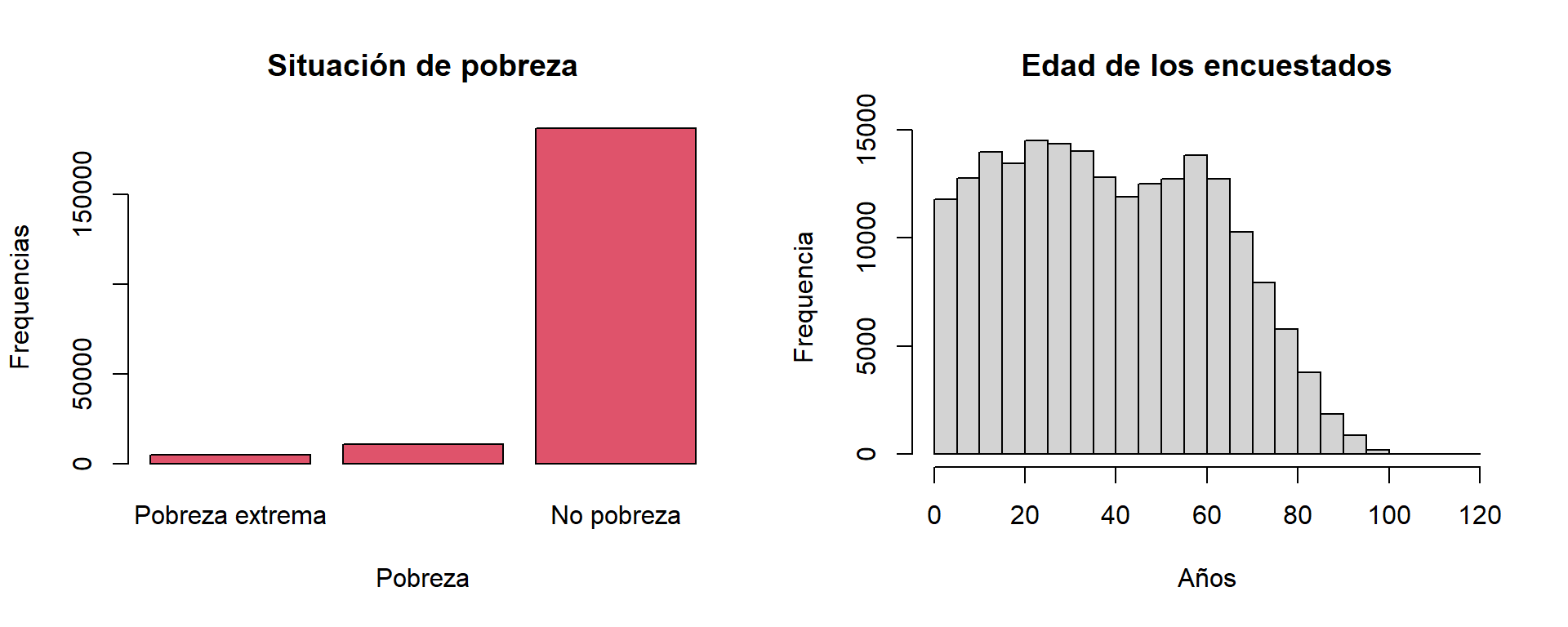 Creamos una nueva variable dicotómica llamada pobrezad (pobreza dicotómica). Usamos mutate() de dplyr y ifelse() para asignar valor 1 si la variable pobreza original está en las categorías 1 o 2 (pobre o pobre extremo), y 0 en caso contrario.