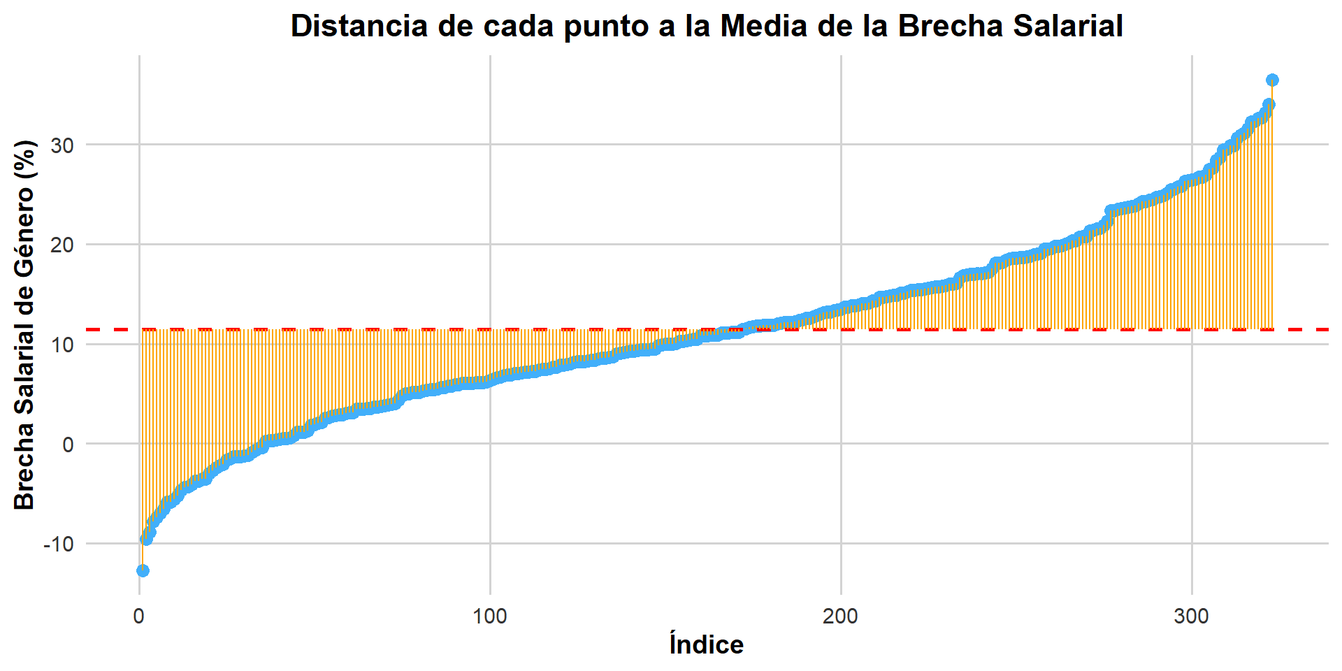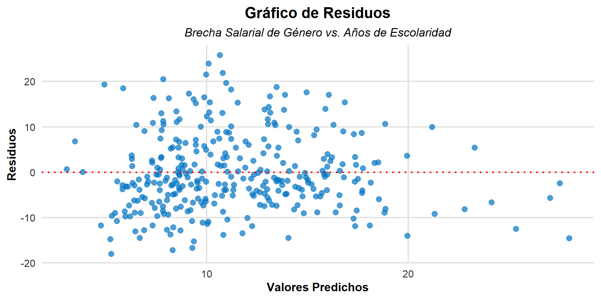 Ideal (Buen Ajuste): Una nube de puntos dispersa aleatoriamente alrededor de la línea horizontal en 0, sin patrones claros. Esto indica homocedasticidad (la varianza del error es constante).